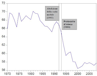 Alcuni rilievi di Mazzei a Brancaccio mi sembrano condivisibili. Però attenzione: tentare di criticare Brancaccio sostenendo che la quota salari seguiva un trend di lungo periodo, indipendente dall'uscita dallo SME, vi mette in una posizione debole. A differenza di quel cozzaro di Bagnai, gli economisti seri come Brancaccio non giudicano i fatti dando occhiate volanti a qualche grafico descrittivo, ma analizzano le possibili relazioni di causa-effetto tramite delle batterie di test statistici. Se il Branka dice che almeno per l'Italia la relazione tra uscita dallo sme e caduta della quota salari è ineccepibile, forse bisogna accettare il fatto e iniziare a prendere contromisure.
