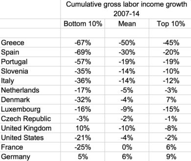 Basta dare una rapida scorsa all’evoluzione delle retribuzioni in Europa negli ultimi anni per rendersi conto degli effetti drammatici di questa “cura letale”. Secondo dati dell’OCSE elaborati da Jan Zilinsky, tra il 2007 e il 2014 il reddito da lavoro (e dunque il potere d’acquisto) del lavoratore medio è diminuito del 50 per cento in Grecia, del 30 per cento in Spagna, del 19 per cento in Portogallo e del 14 per cento in Italia. Per i lavoratori a basso reddito le cose sono andate ancora peggio: -70 per cento in Grecia e Spagna, -60 per cento in Portogallo, -35 per cento in Italia[2]. E poi ci si sorprende che l’inflazione cali, fino a lasciare il posto alla deflazione?