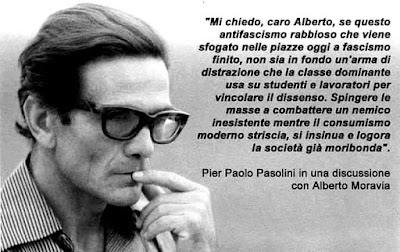 la critica agli antifascisti ( riassumibile nello slogan "antifascismo in assenza di fascismo : quindi arma di distrazione" ) poteva avere un senso ( ma neanche tanto ) detto da Pasolini a Moravia : cioè in un periodo storico dove i lavoratori erano ancora i cosiddetti "nazionali" ; dove si comunicava con le lettere spedite per posta , che arrivavano , se arrivavano , dopo una decina di giorni ; e dove per "migrare" , si intendeva il viaggio da Avellino a Torino .